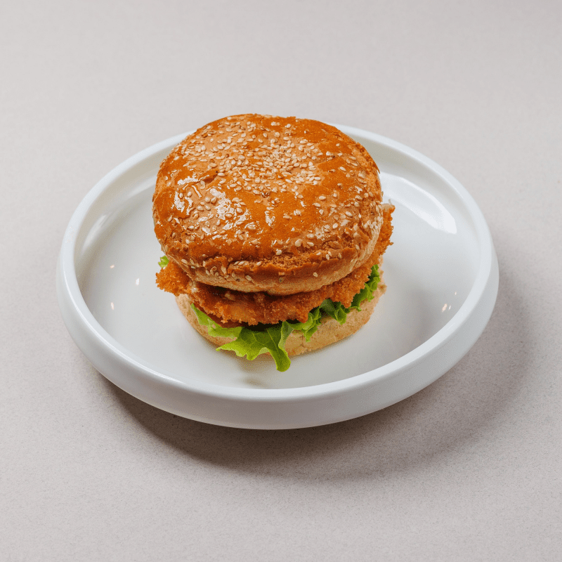 Булочка собственного приготовления, куриное филе в панировке, лист салата, помидоры, огурцы, соус цезарь, сырный соус, соус терияки