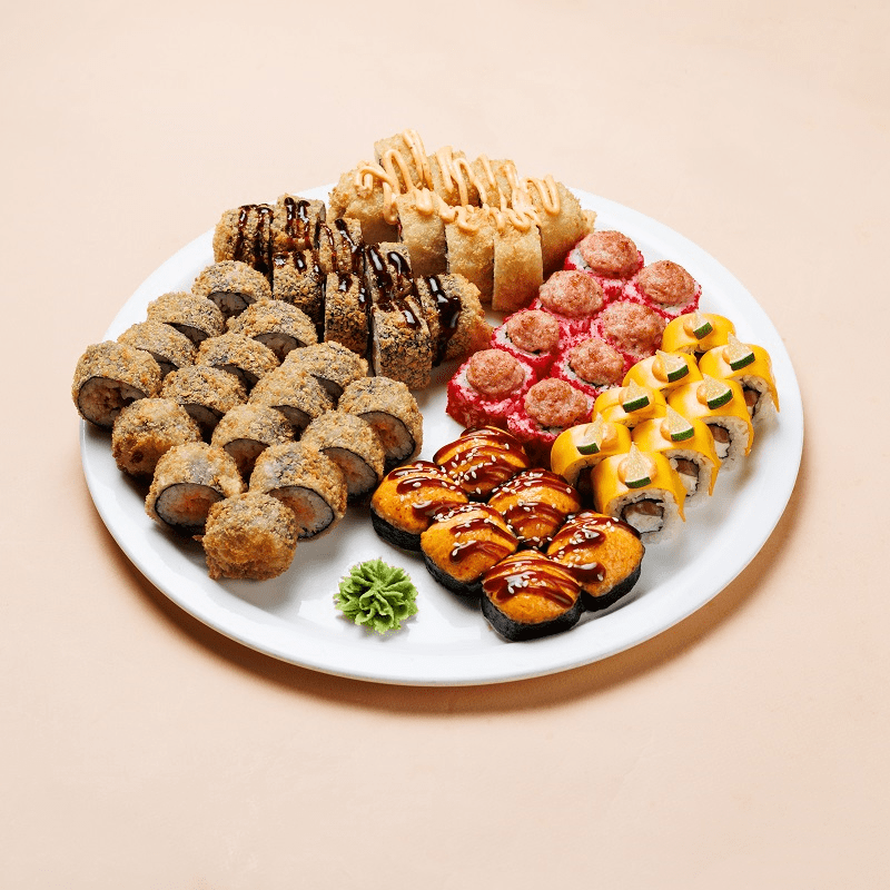 Ролл темпура курица в кисло-сладком соусе, Ролл "Мехико" , запеченный ролл с беконом, ролл спайси краб 12 штук, ролл Калифорния темпура в спайси соусе, ролл курица темпура в соусе унаги, ролл темпура острая семга