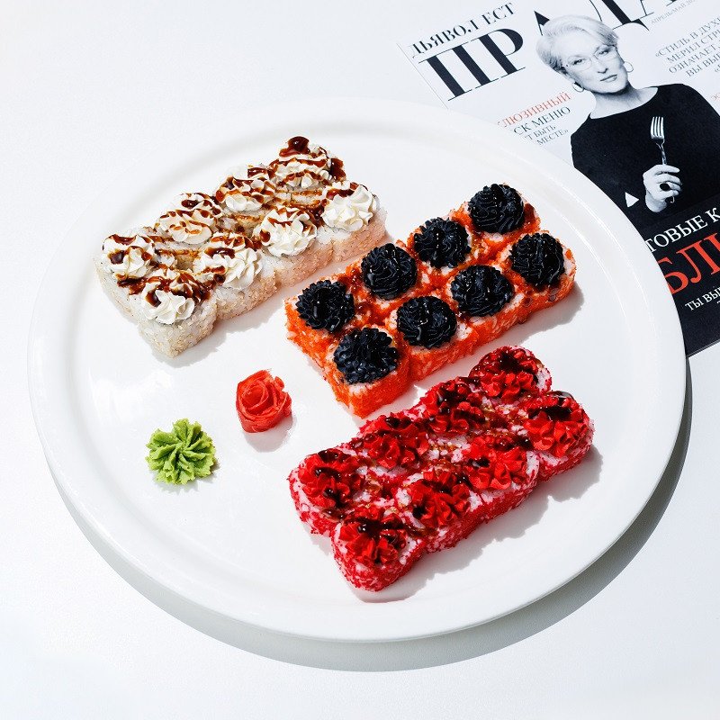 Ролл "Миранда" с семгой, огурцом, икрой масаго и творожной шапочкой под соусом унаги; ролл "Андреа" с чиром, огурцом, кунжутом и творожной шапочкой под соусом унаги, ролл "Эмили" с курицей, икрой масаго с творожной шапочкой под соусом унаги
