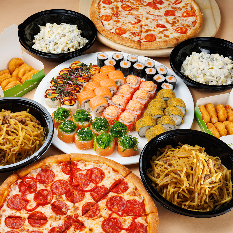 Салат Корейский с картофлеем 800 гр., Салат Оливье мясной 800 гр, Филадельфия, Чикен хотто, Филадельфия спешл с чукой, хосомаки с семгой 12 шт., Нацу сяке ролл, Урамаки, наггетсы с кетчупом 2 порции, пицца Маргарита и Пепперони