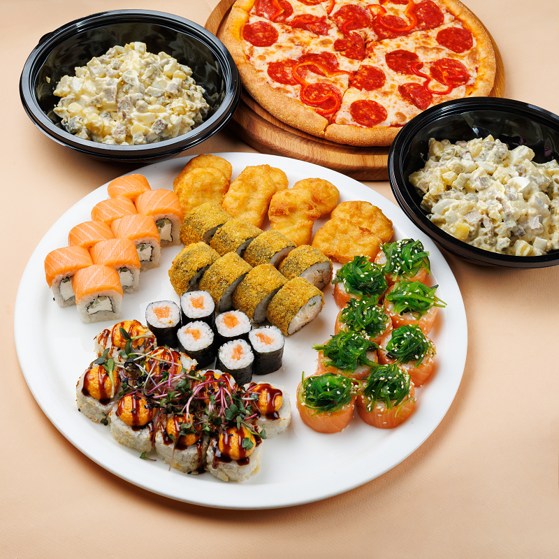 Салат Оливье мясной 800 гр., Филадельфия, Чикен хотто, Филадельфия спешл с чукой, хосомаки с семгой 6 шт., Нацу сяке ролл, пицца «Пепперонушка» (25 см), наггетсы с кетчупом 1 порция