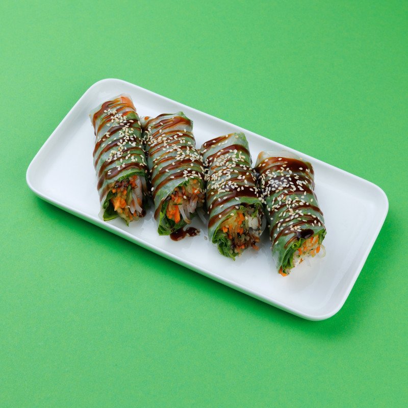 Рисовая бумага, семга, листья салата, морковь, зелень, огурцы, стеклянная лапша